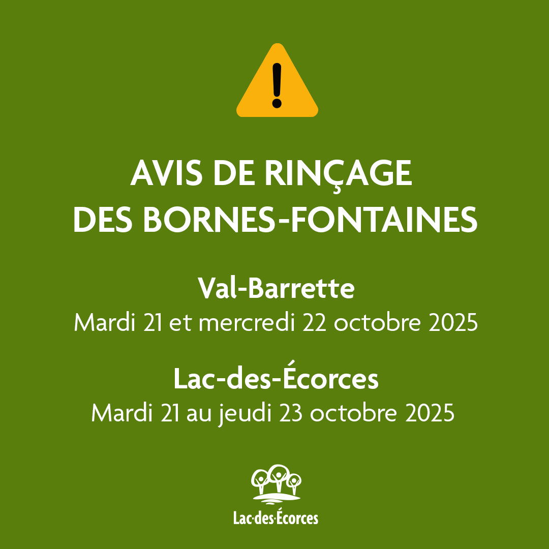 La Municipalité procèdera au rinçage de ses bornes-fontaines. Lac-des-Écorces : du mardi 21 octobre au jeudi 23 octobre 2025 Mardi de 13h à 17h Mercredi