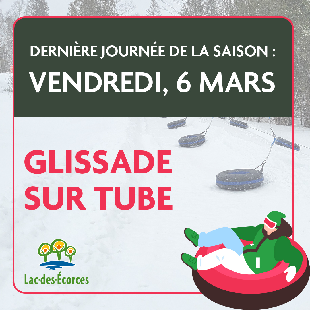 ❄️ Dernière journée de la saison❄️ Glissade sur tube : À cause de la quantité importante de pluie prévue demain, aujourd’hui sera notre dernière journée de glisse de la saison. Il est encore temps d’en profiter! Deux blocs de glisse sont offerts aujourd’hui, dont notre bloc spécial en soirée :