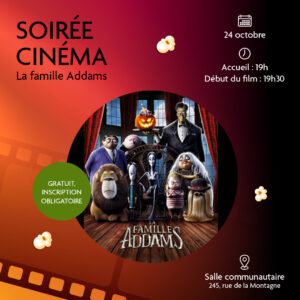 Vendredi, le 24 octobre prochain, viens passer la soirée avec et tes amis! Dans une ambiance d’Halloween, le film d’animation La famille Addams sera présenté à la salle communautaire. Apporte ta couverture/doudou et tes coussins pour t’installer confortablement. L’activité est gratuite et nous fournissons popcorn, chips, friandises et breuvages !! Pour nous aider dans notre organisation, merci de t’inscrire juste ici : https://forms.gle/rwEEV993JCRKfpGu6
