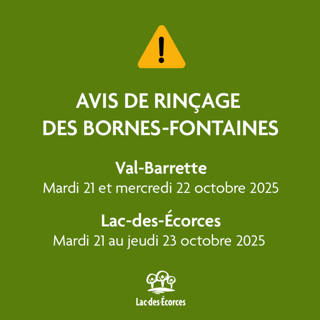 La Municipalité procèdera au rinçage de ses bornes-fontaines. Lac-des-Écorces : du mardi 21 octobre au jeudi 23 octobre 2025 Mardi de 13h à 17h Mercredi de 13 h à 17h Jeudi de 8h à 17h Val-Barrette : mardi 21 octobre et mercredi 22 octobre 2025 Mardi de 8h à 12h Mercredi de 8h à 12h […]