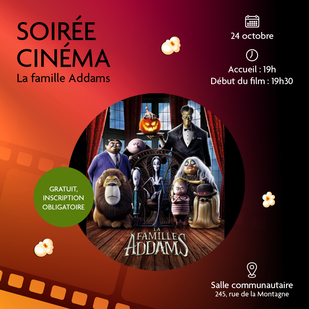 Vendredi, le 24 octobre prochain, viens passer la soirée avec et tes amis! Dans une ambiance d’Halloween, le film d’animation La famille Addams sera présenté