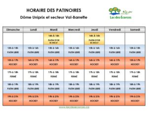 Pour connaître l’horaire des patinoires, veuillez vous référer au tableau ci-dessous :